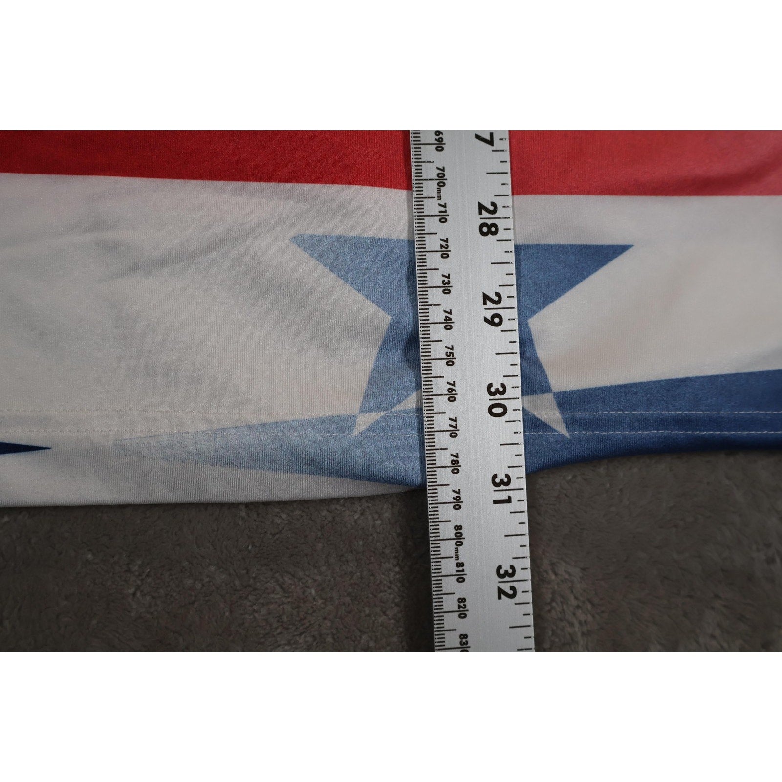 Features bold USA flag graphics and stars in red, white, and blue on both front and back