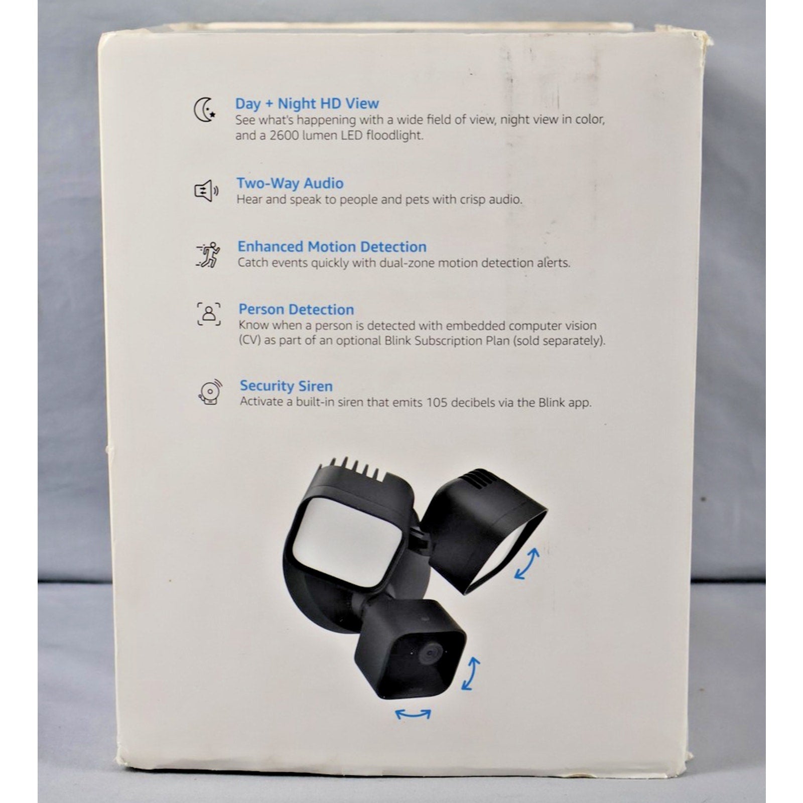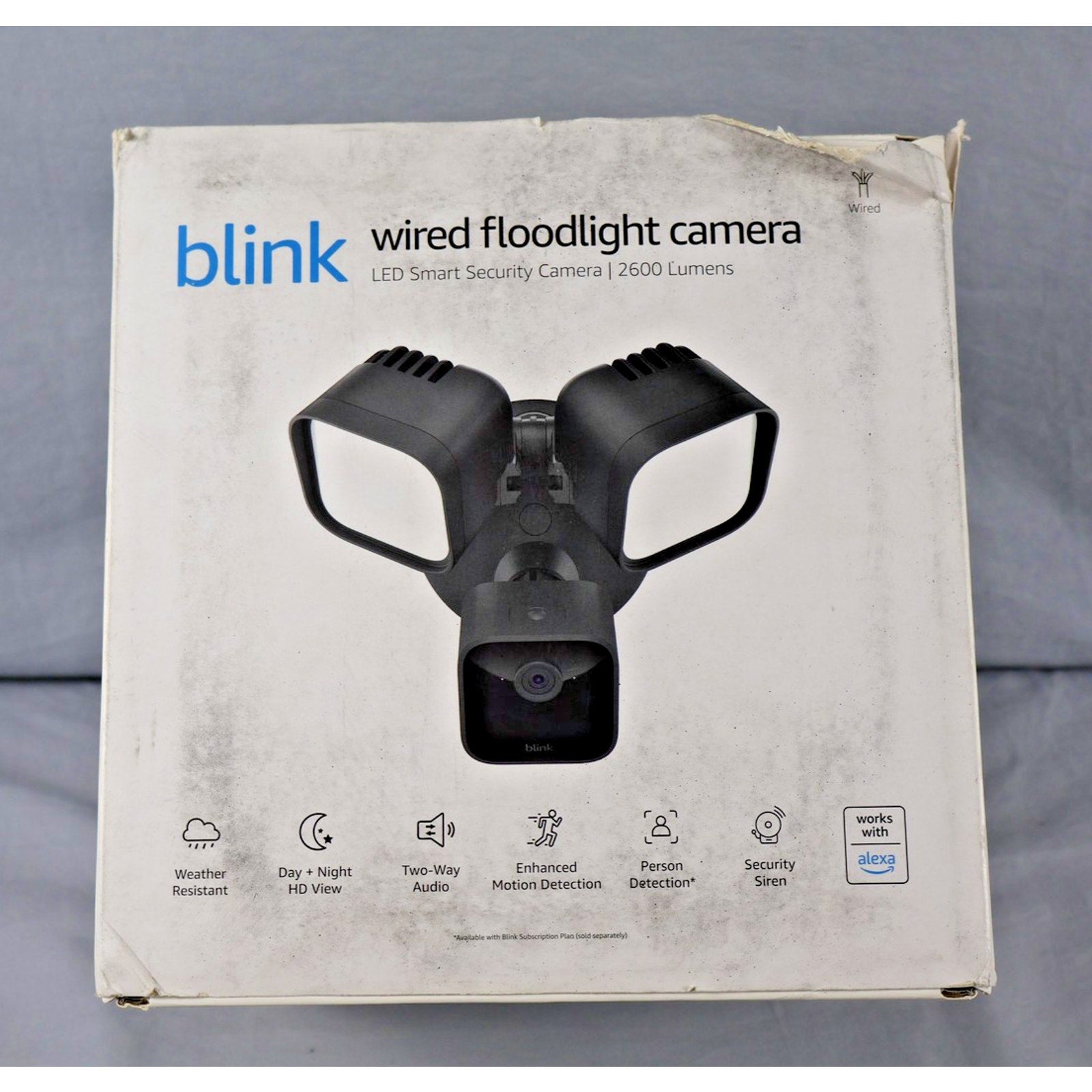 Includes: Blink Wired Floodlight Camera (brand new, unopened), original manufacturer's packaging (box only, some exterior wear present).