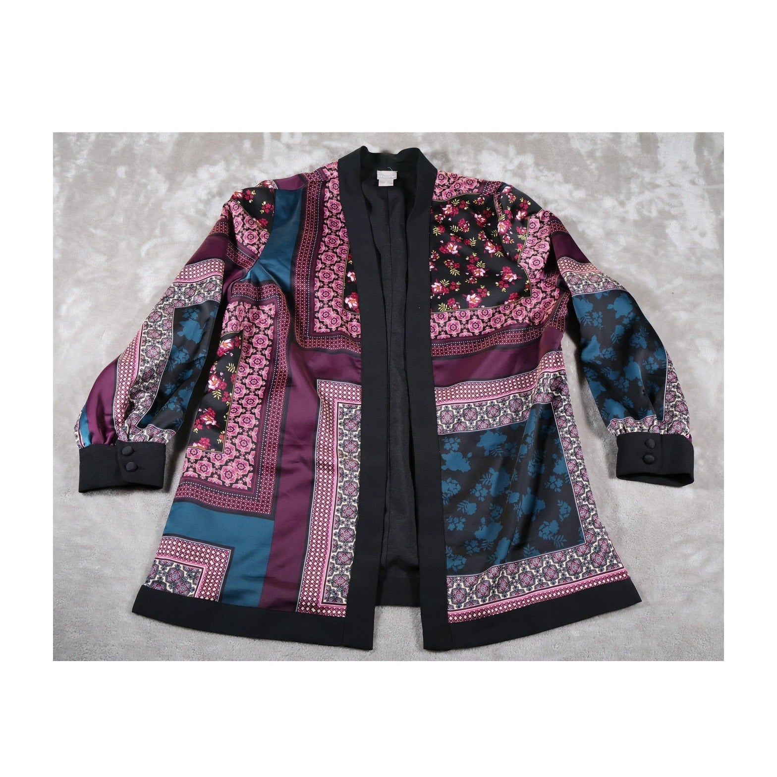 Chicos Jacket Womens 2 Large Multicolor Open Front Floral Patchwork Boho Kimono
