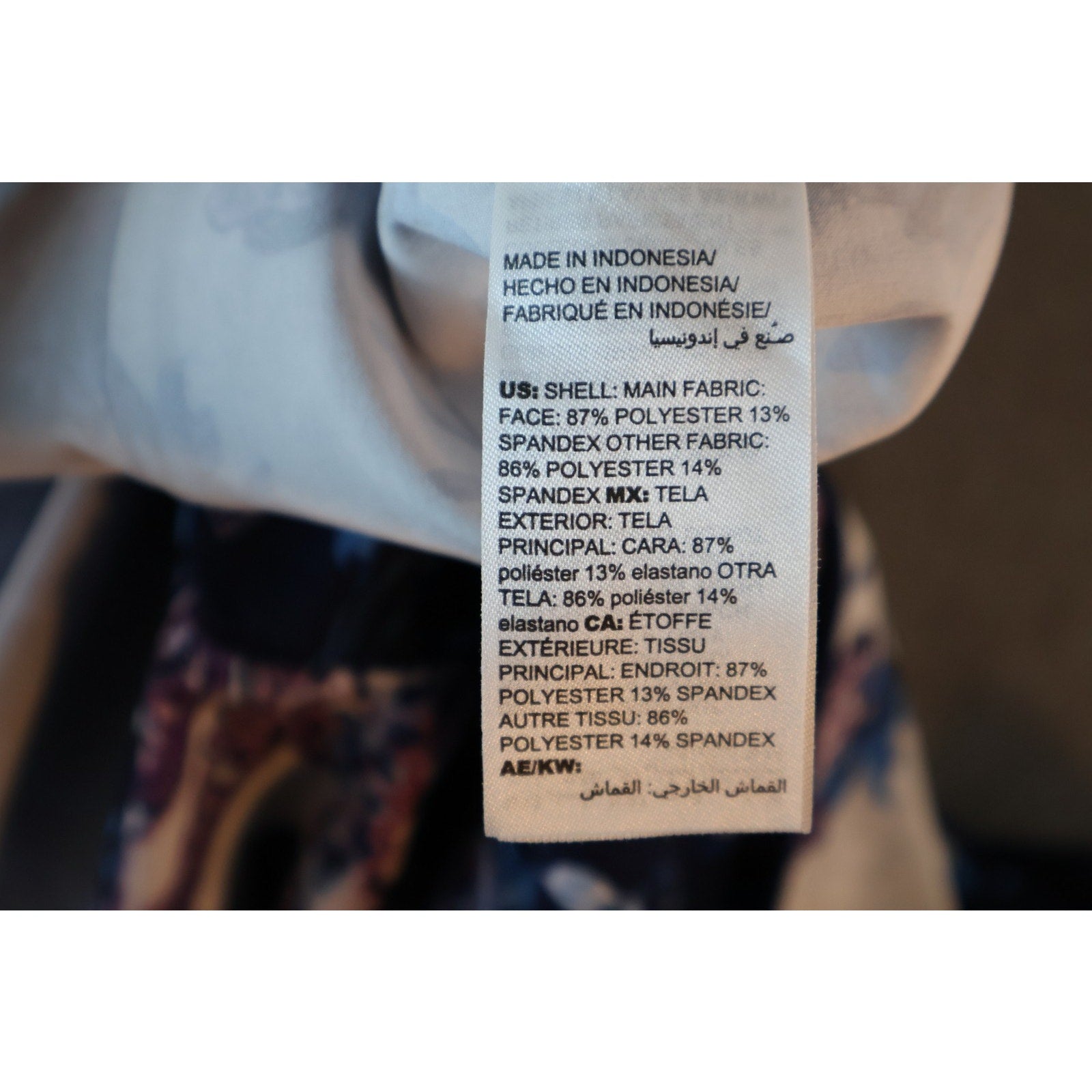 Shell (main fabric): 87% polyester, 13% spandex. Other fabric: 86% polyester, 14% spandex.