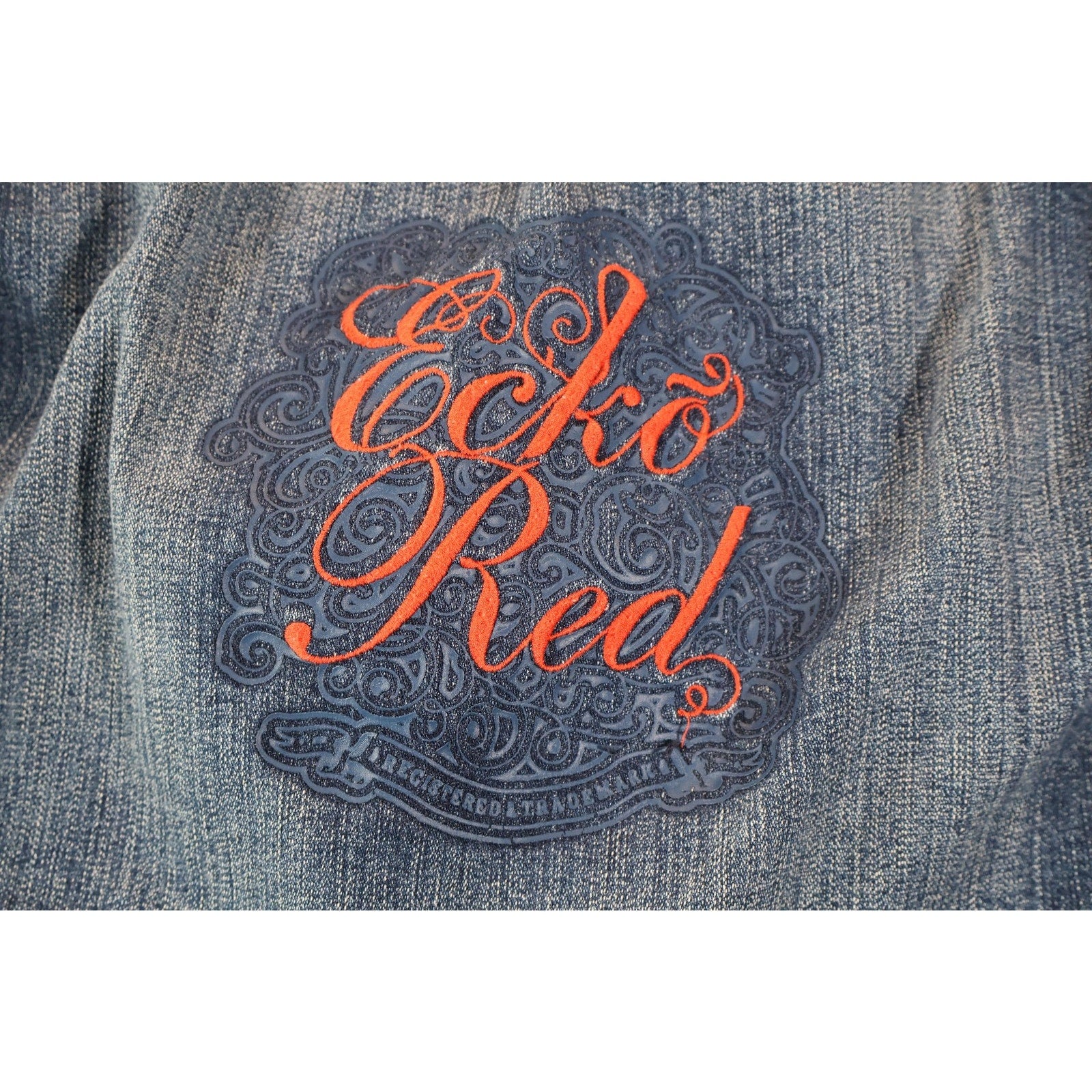 Back Details: Large ornate "Ecko Red" graphic and denim brand patch at hem