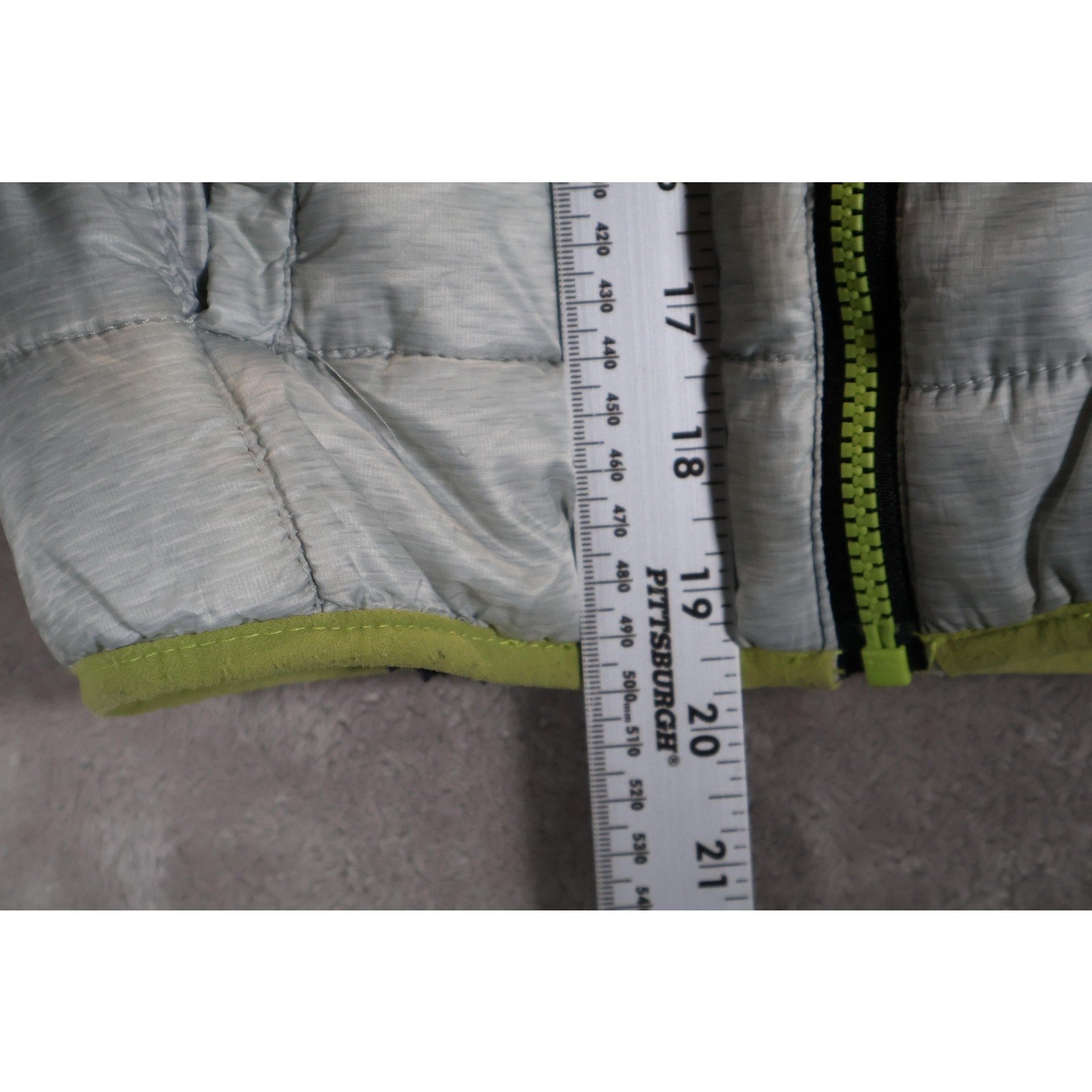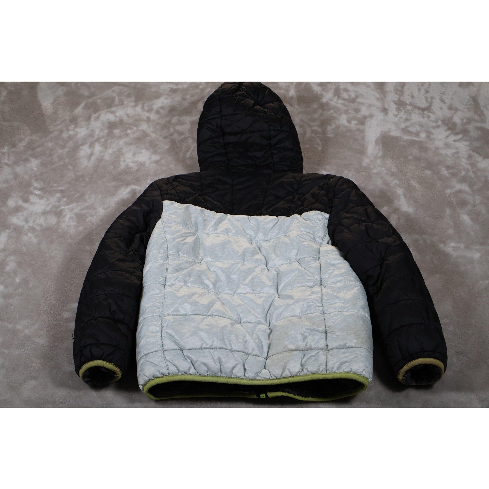 Features a black and gray color block exterior with bright green zipper and trim details.