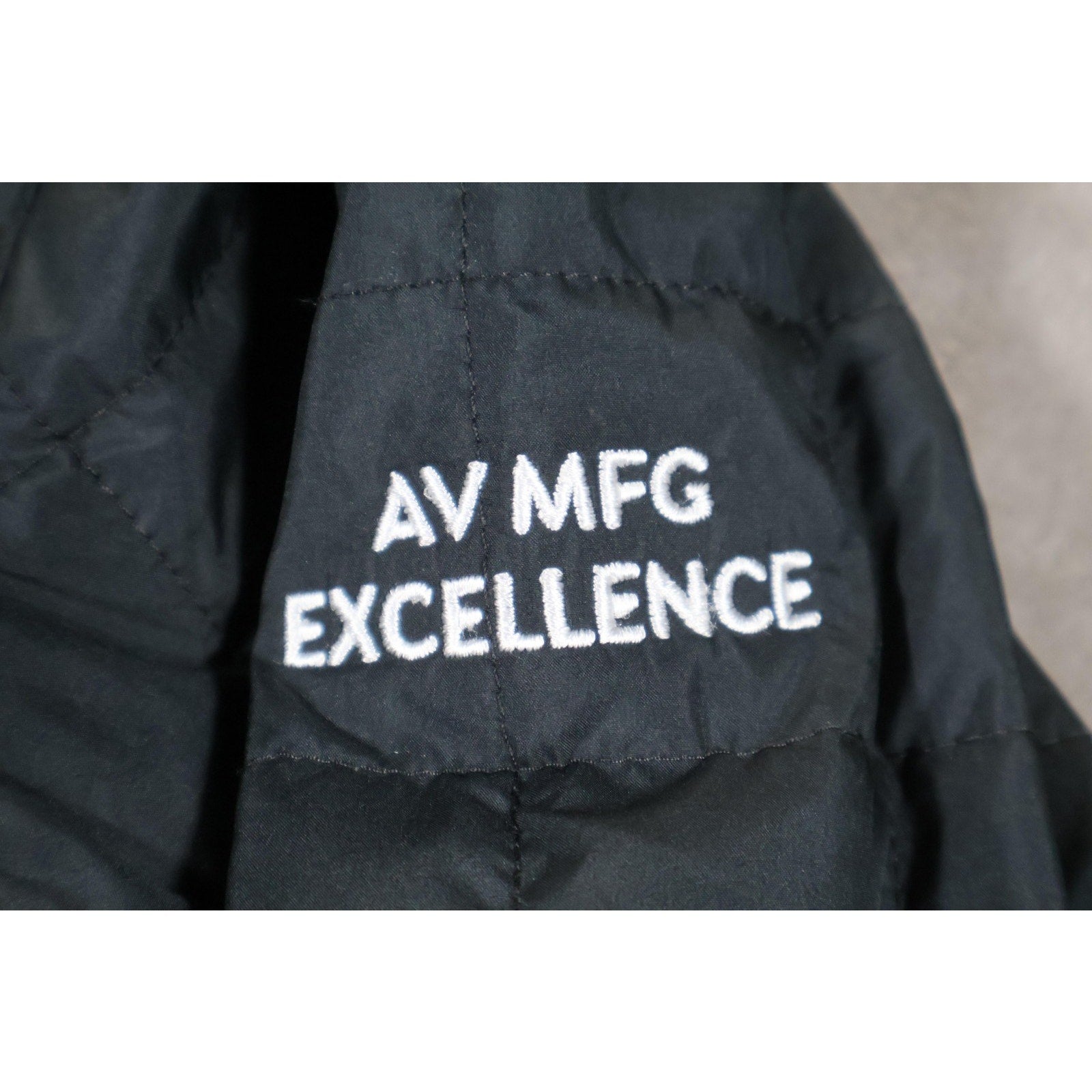 Embroidered "AV MFG EXCELLENCE" logo on upper right sleeve
