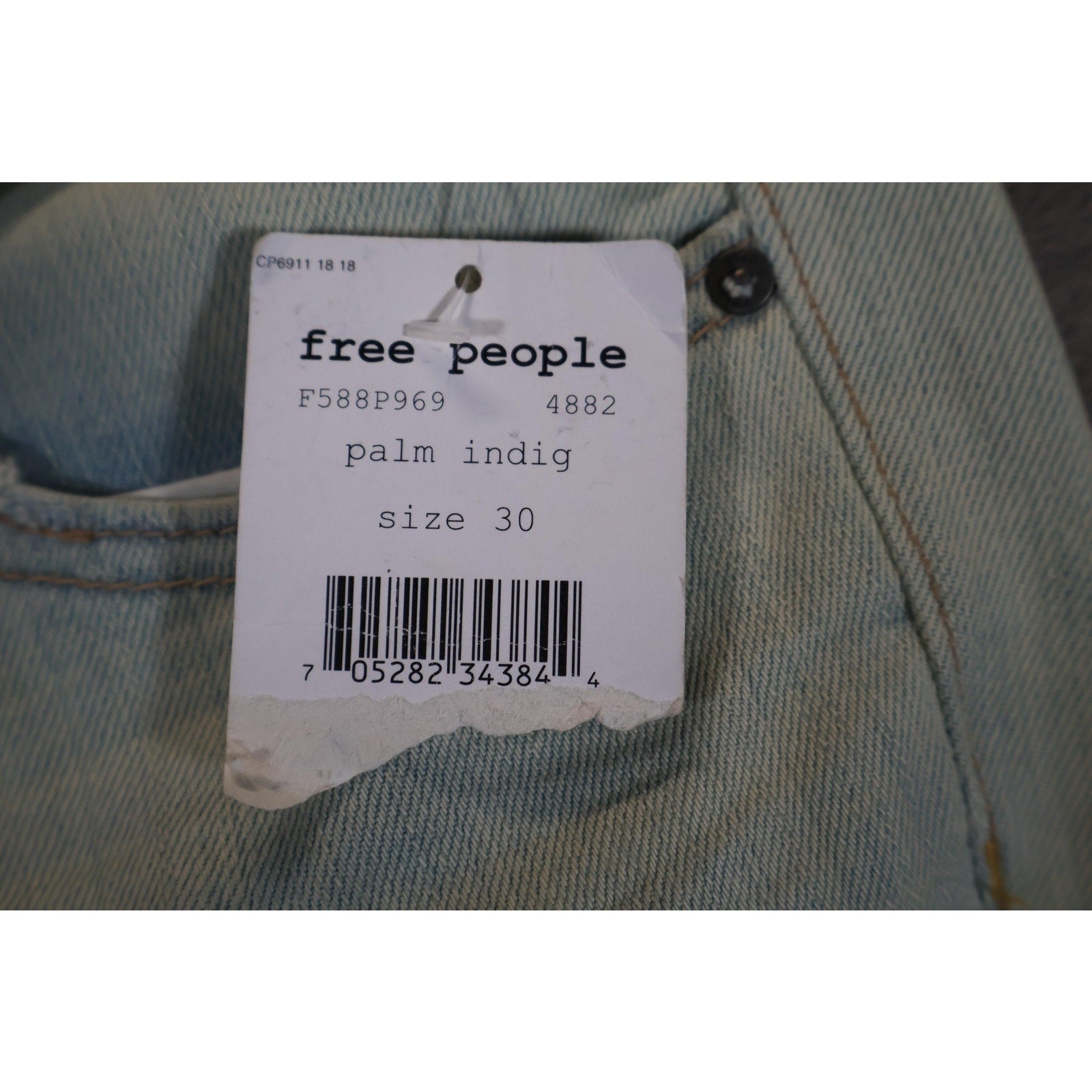 Features 5-pocket styling, zip fly, and button closure with "Free People" branded hardware