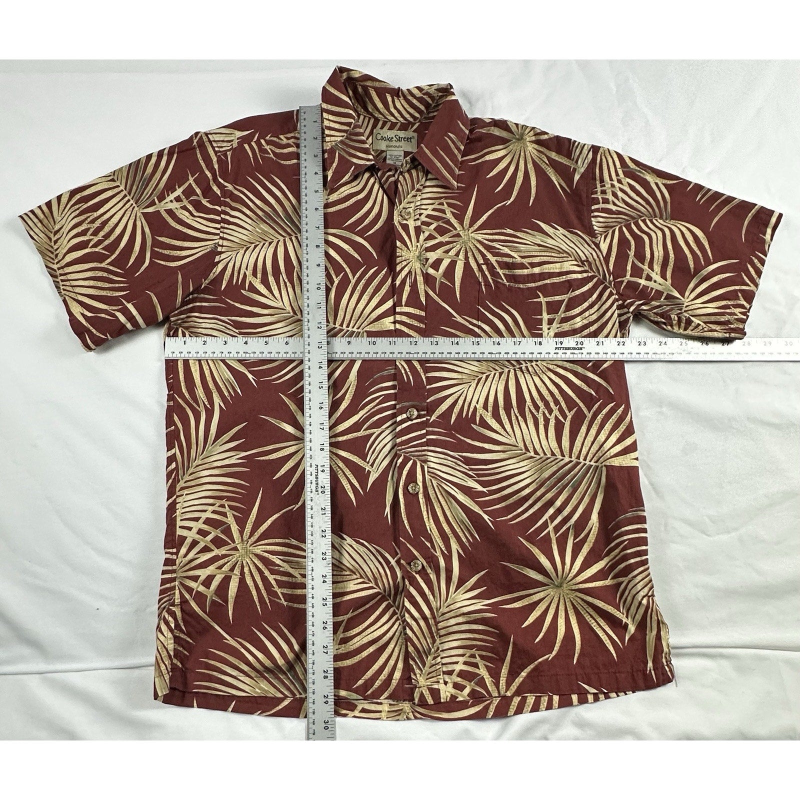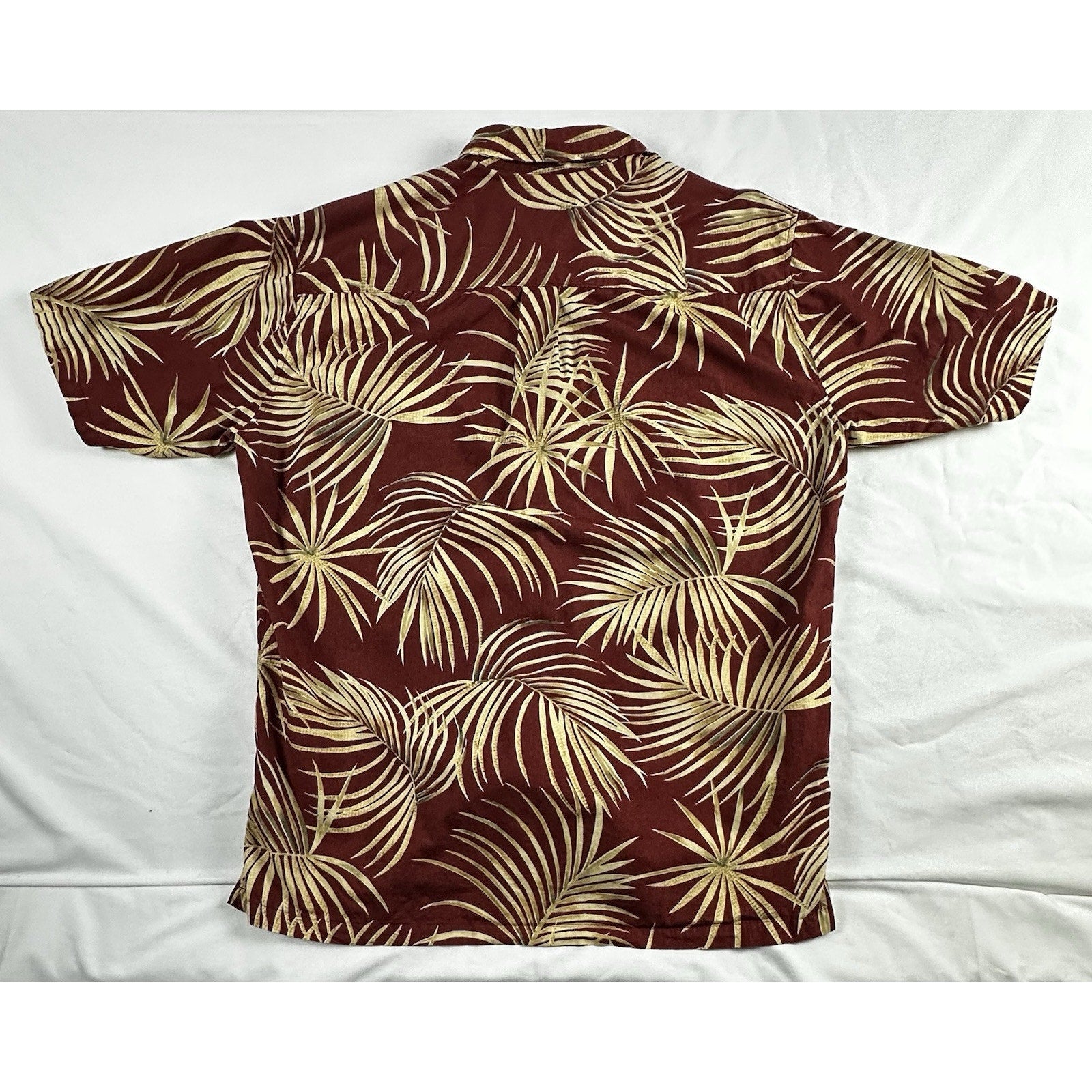 Cooke Street Aloha Hawaiian shirt in men's medium. Features a red/maroon leaf print. This shirt is perfect for adding a touch of island style to your wardrobe. It’s lightweight and comfortable, ideal for casual outings or vacation wear.