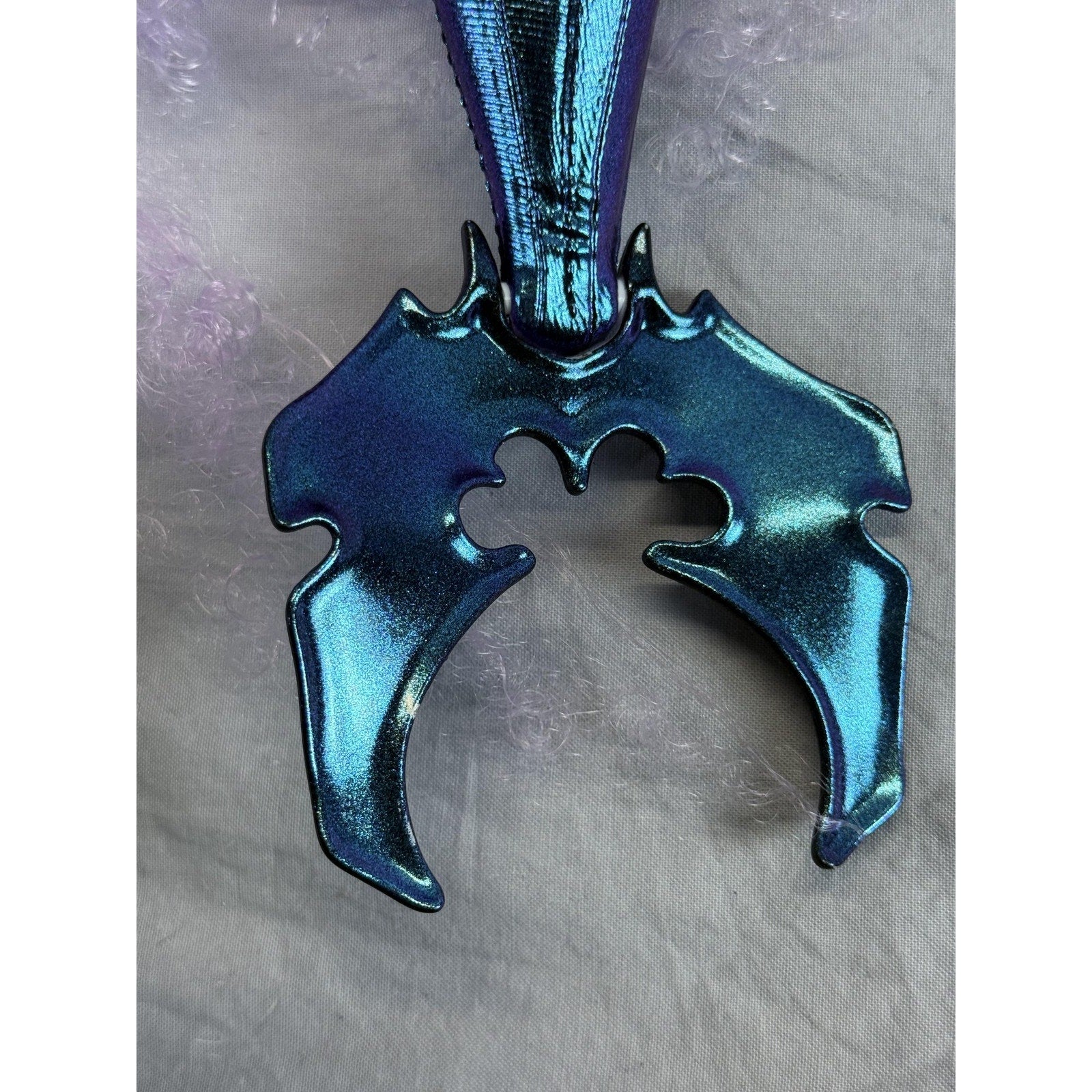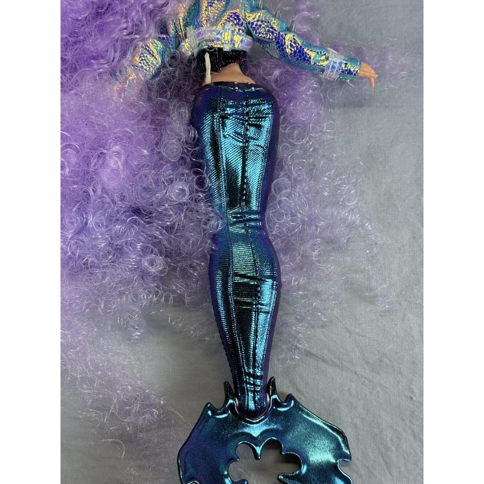 Mermaid tail is metallic blue/teal with seam and stud detailing along the front and a dramatic sculpted fin in matching metallic finish.