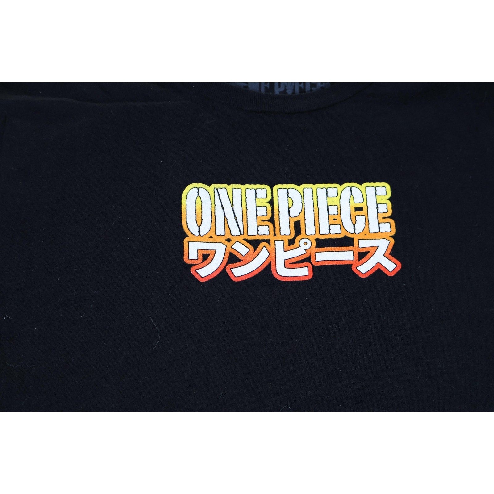 Features the official One Piece logo with Japanese text on the front chest and a large colorful graphic of Luffy and the Straw Hat crew on the back.