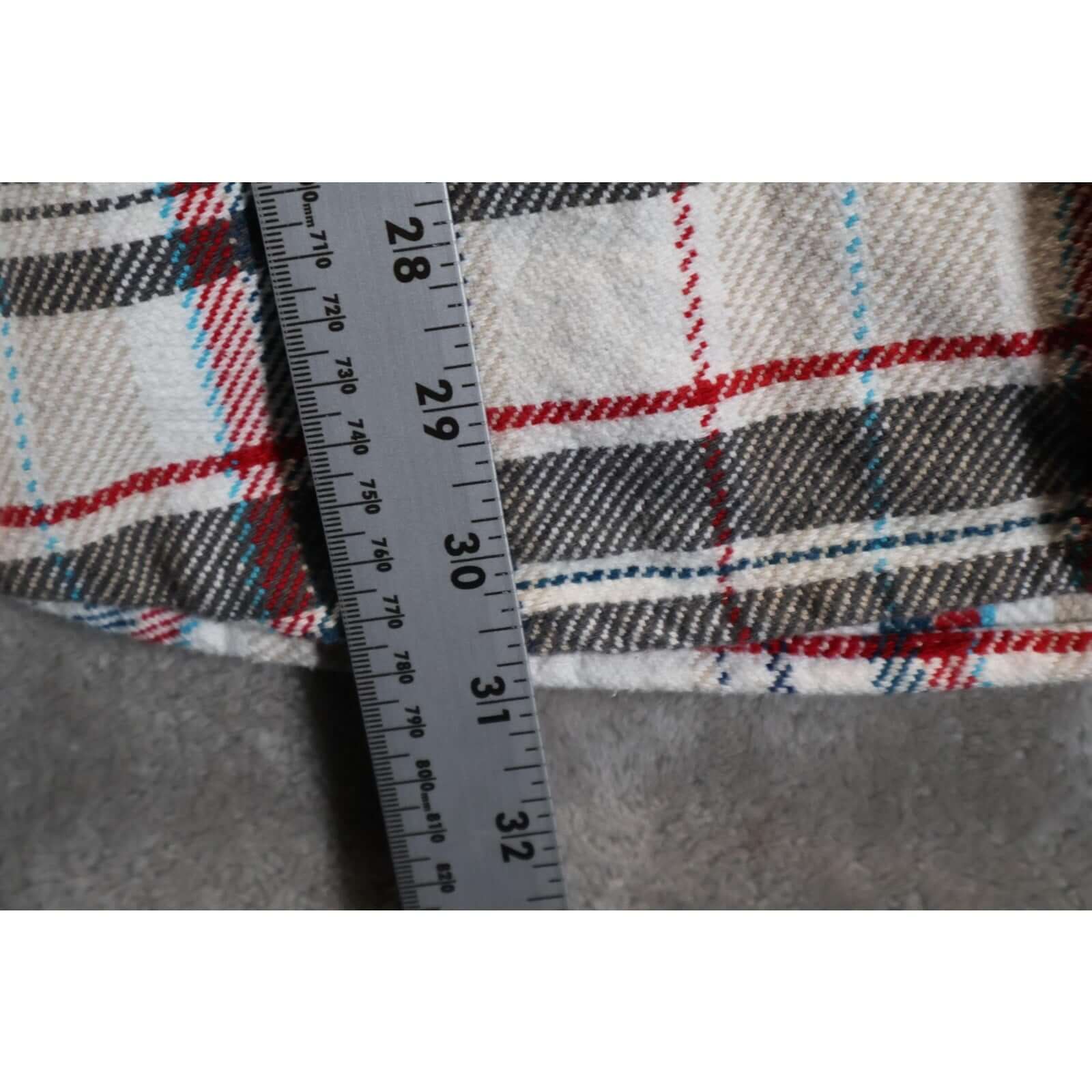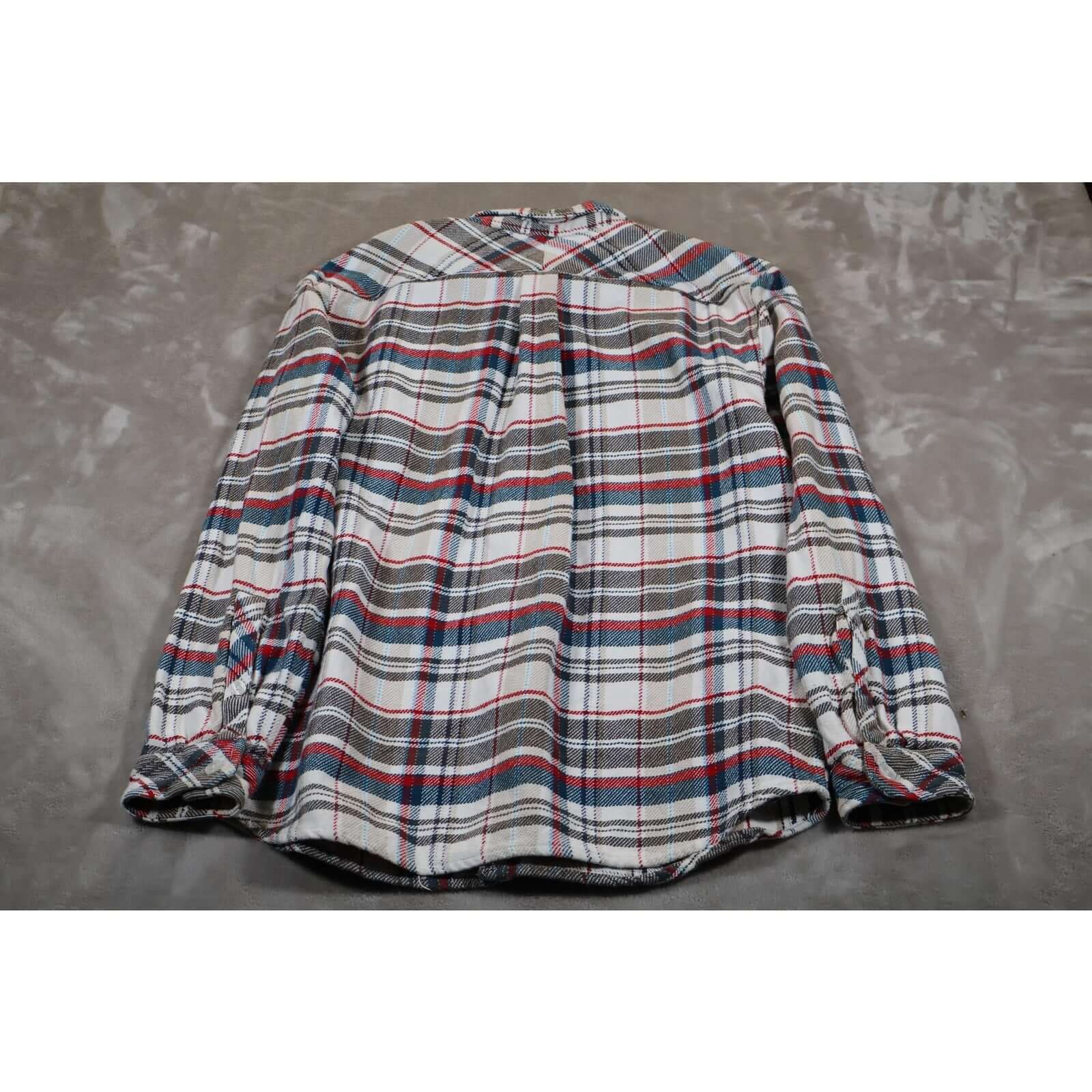 Classic plaid flannel pattern in white, red, blue, and tan. Features two chest flap pockets with button closure.