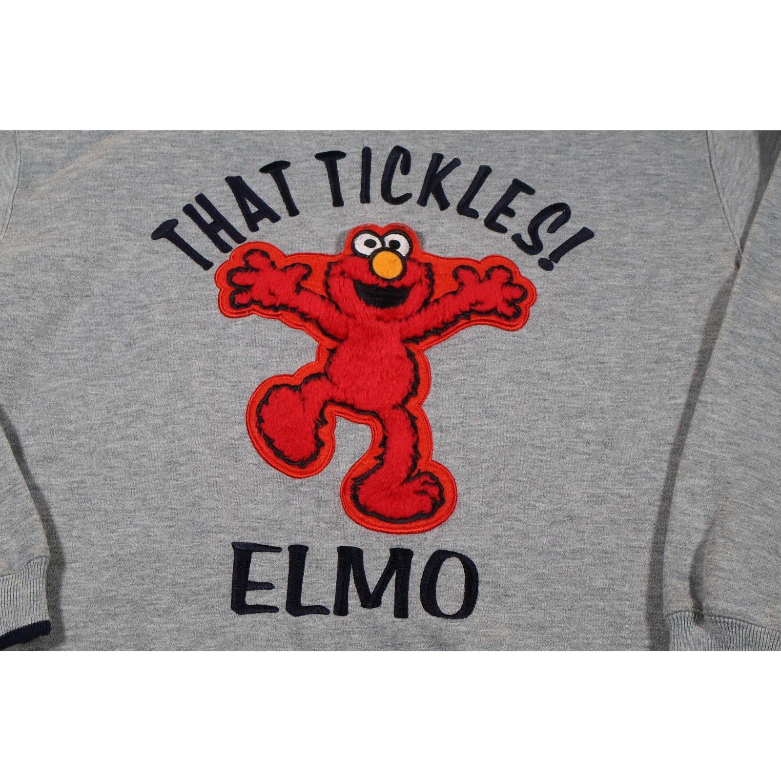 Features a large fuzzy Elmo applique on the front with the phrase "That Tickles!" and "ELMO" embroidered below.