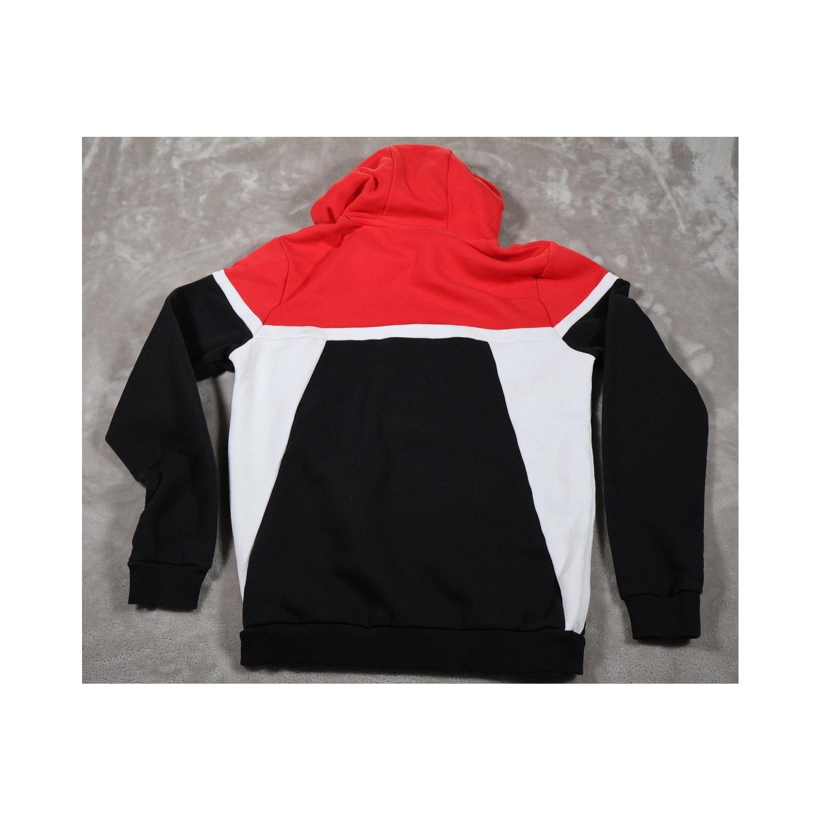 Features bold colorblock design in red, black, and white