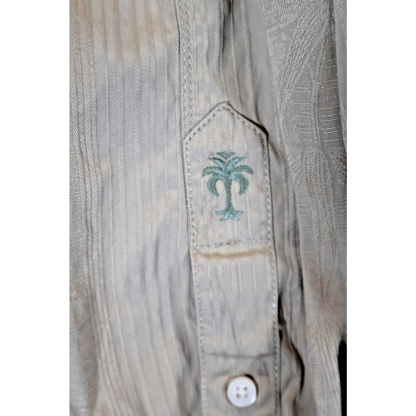 Single chest pocket. Button front closure. Button cuff sleeves with signature stitched palm tree accent. Curved hem for a relaxed fit.