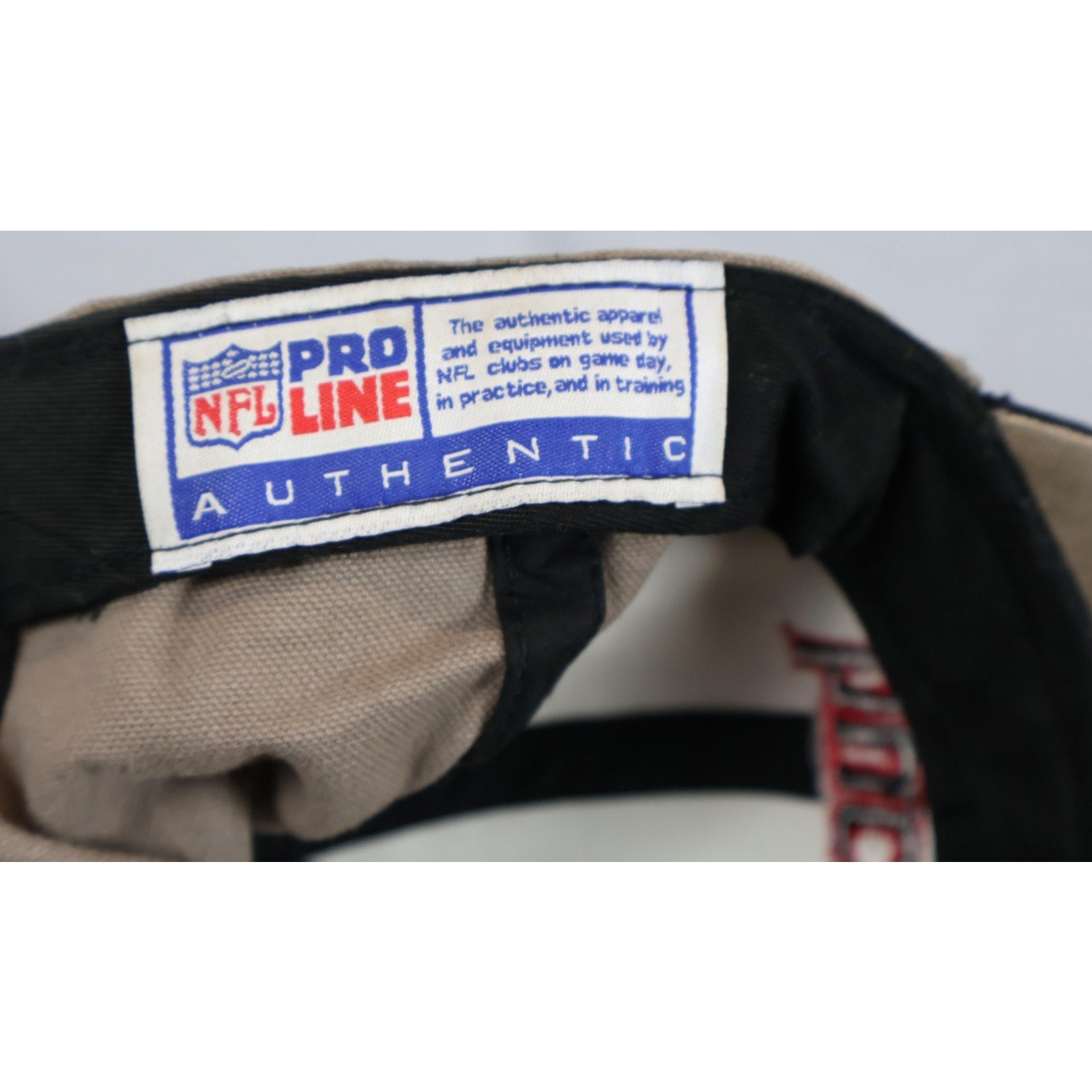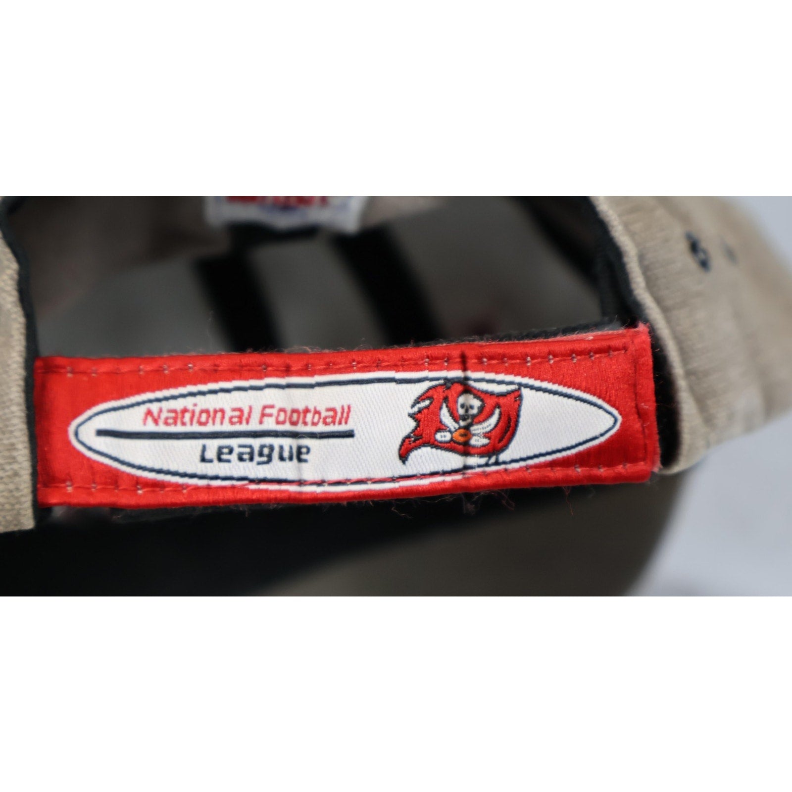 Features: Two-tone gray and black panel construction with red accent stripe. Embroidered "Tampa Bay Buccaneers" script on front. Multiple vintage Buccaneers logos and NFL shield embroidered on cap and underside. Interior features Pro Line AUTHENTIC and National Football League tags, as well as a Reebok branding label. Strap back adjustable closure.