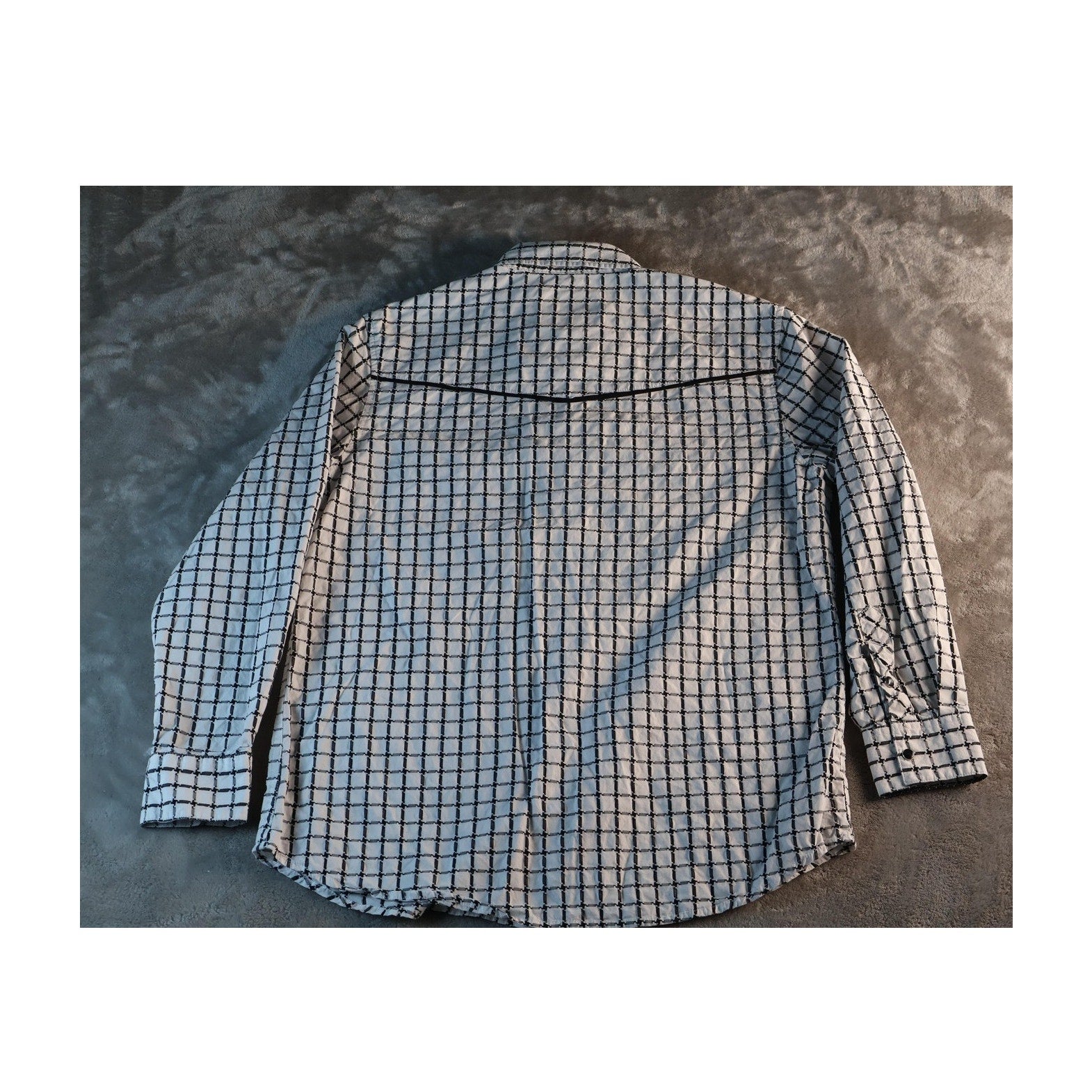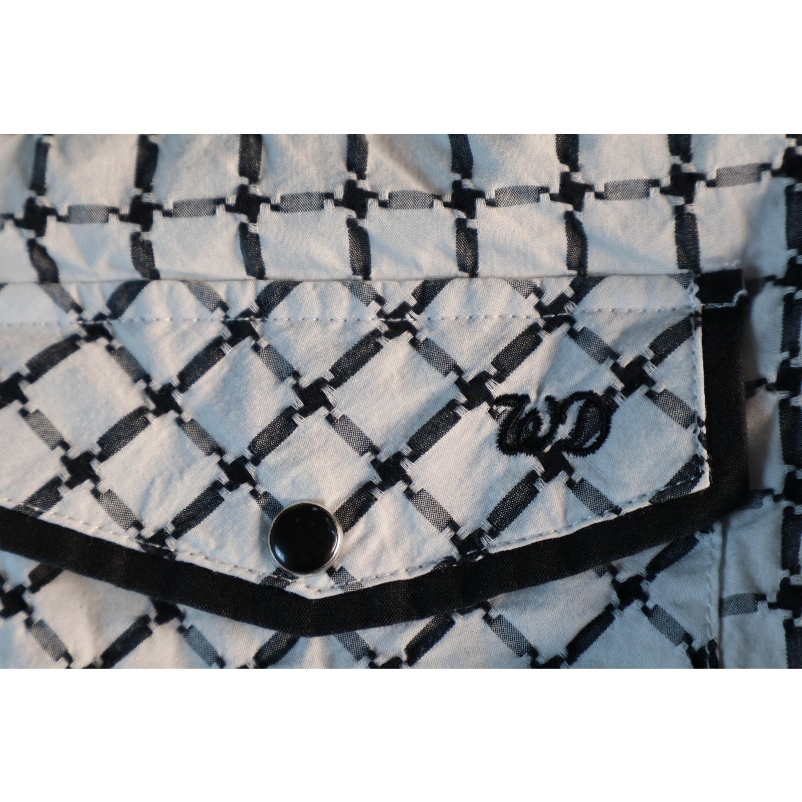 Distinctive black and white check patterned western shirt featuring full pearl snap front closure and double chest pockets with black piping.
